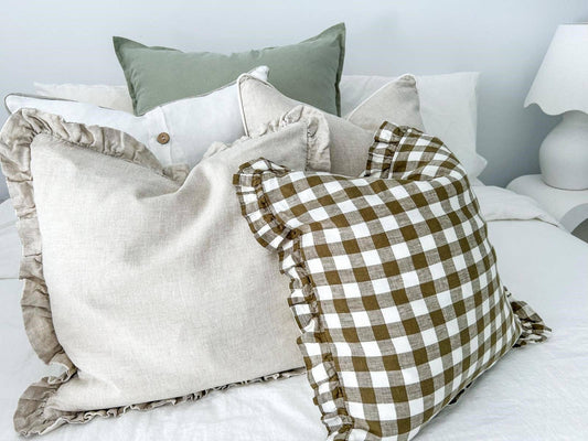 Reversible Linen Ruffle Cushion Cover - Olive Gingham - Warm White