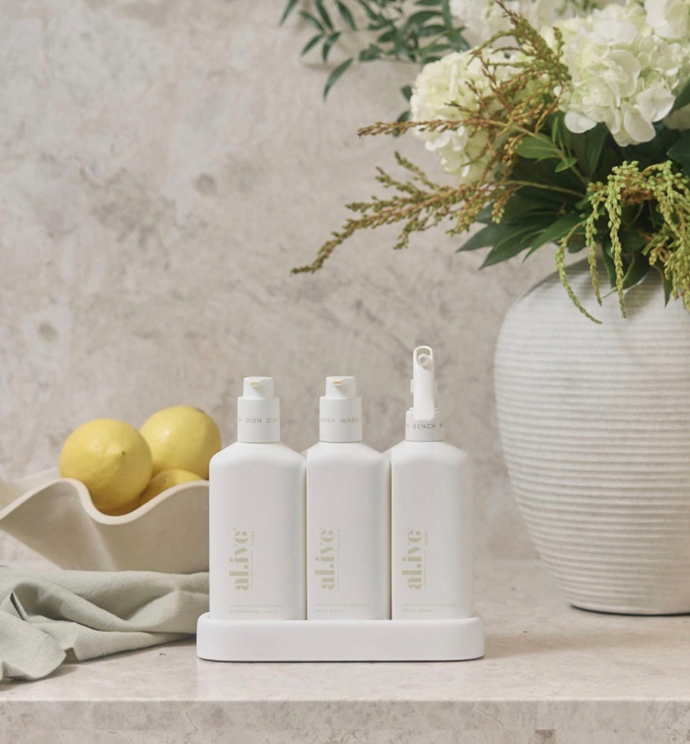 Each Trio includes a 300ml Lemon Myrtle & Honeydew Dishwashing Liquid, a 300ml Lemon Myrtle & Honeydew Hand Wash, a 300ml Lemon Myrtle & Honeydew, Bench Spray and a matching custom tray.