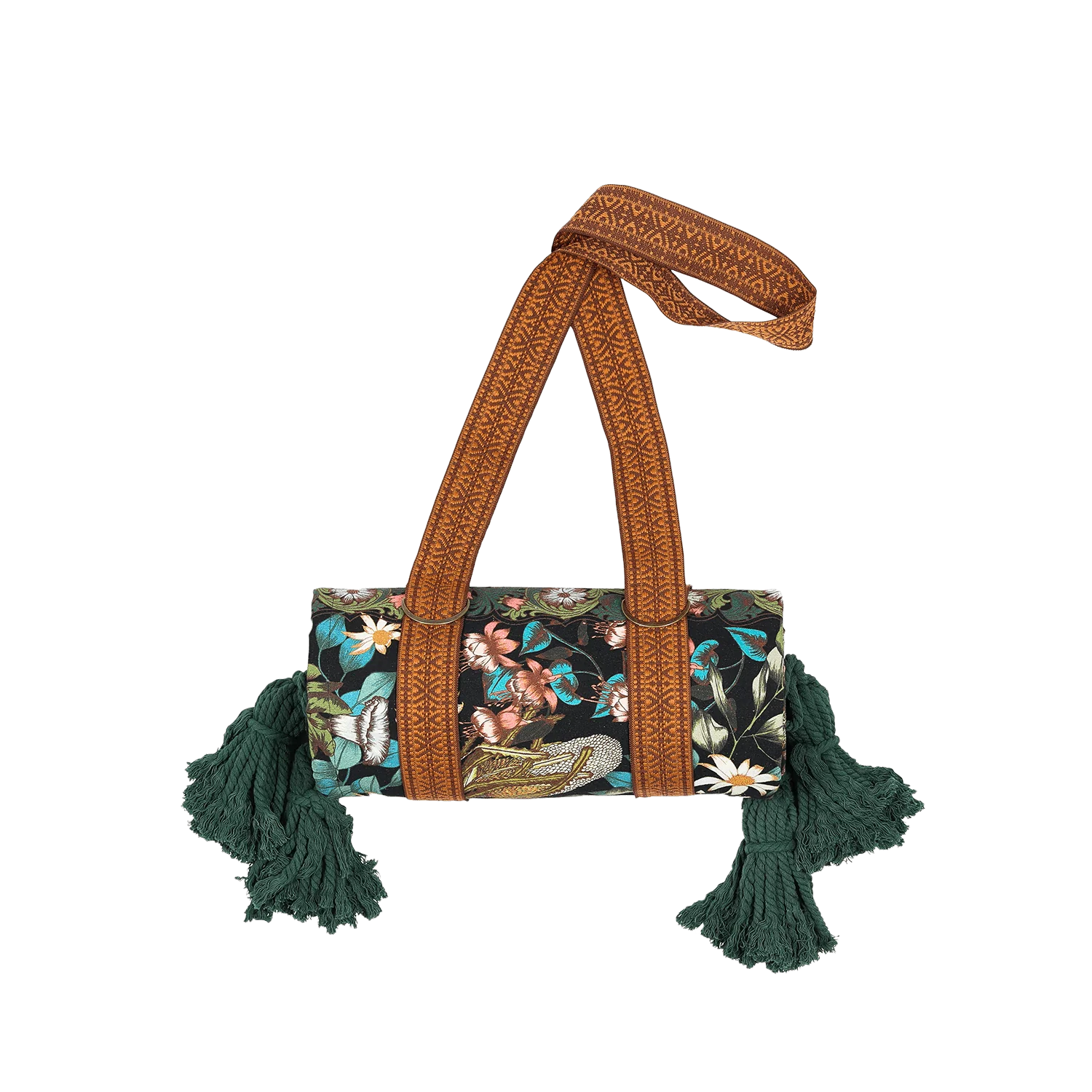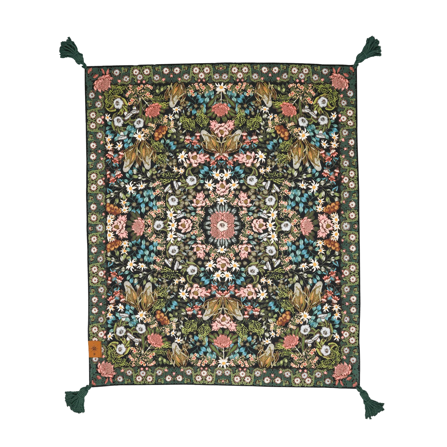Printed on our durable 100% recycled PET canvas that's fade proof and water resistant. The base features our trusty brown water resistant poly/cotton canvas with a waterproof treatment. Framed by large cotton tassels in each corner to keep your rug weighed down, and lastly it comes with a handy ornate brown woven carry strap.