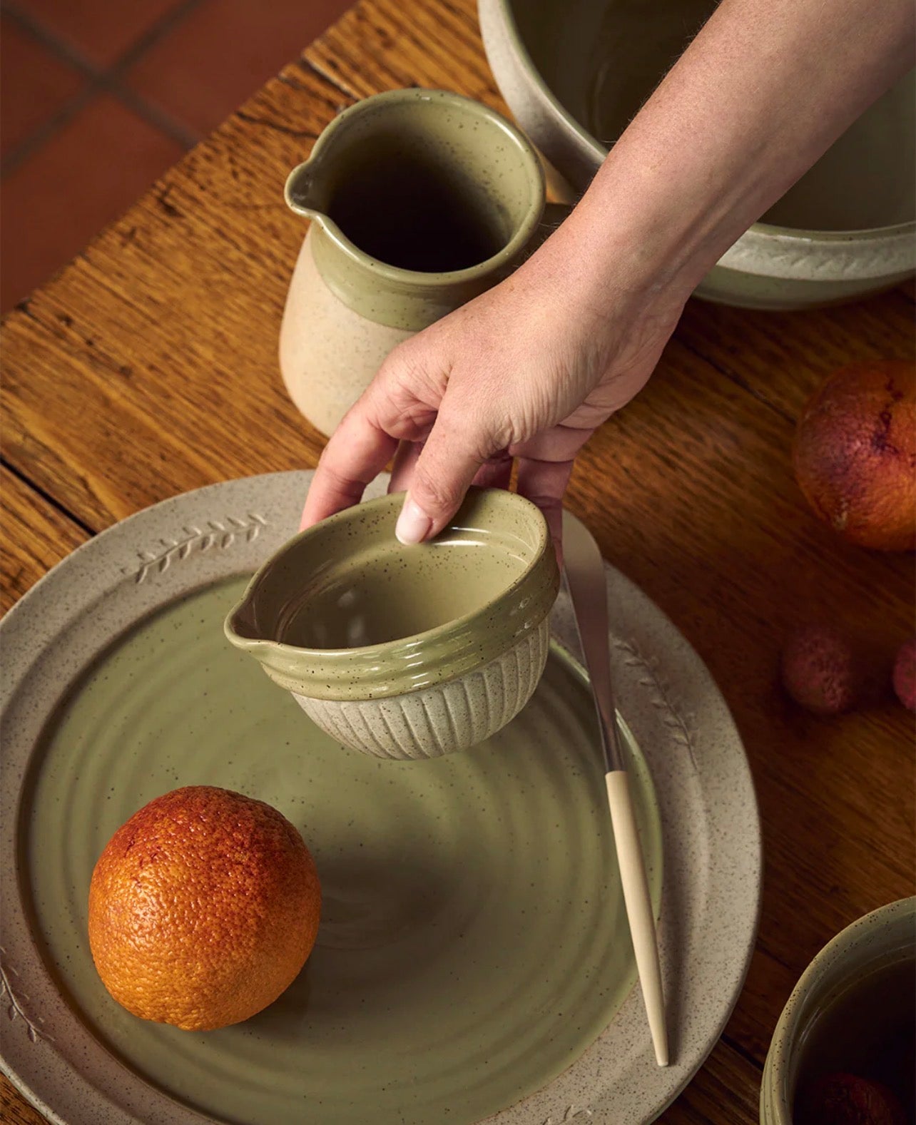 Inspired by the steady rhythm of the kitchen, this collection celebrates the beauty of daily preparation and time spent cooking. Subtle glazes and gentle leaf embellishment introduce softness and balance to everyday cooking, finished in a reactive glaze with delicate speckling.