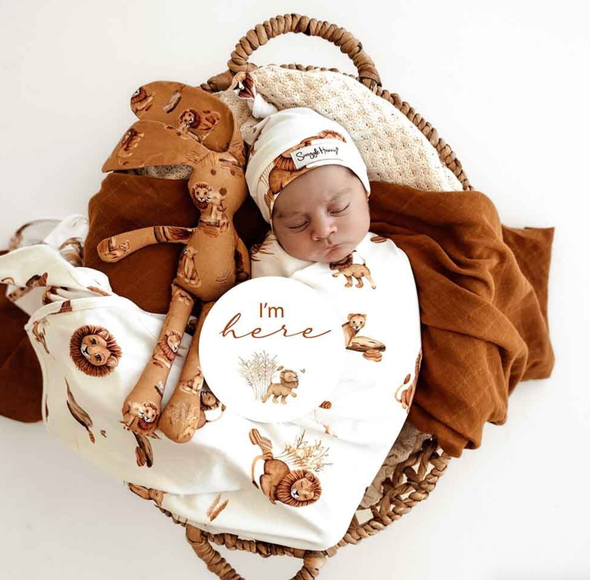 The Snuggle Hunny organic cotton jersey wrap with matching beanie is soft, snuggly and stretches with baby. This wrap features our exclusive Snuggle Hunny Lion design and is made with GOTS Certified Organic Cotton CU 1182228.