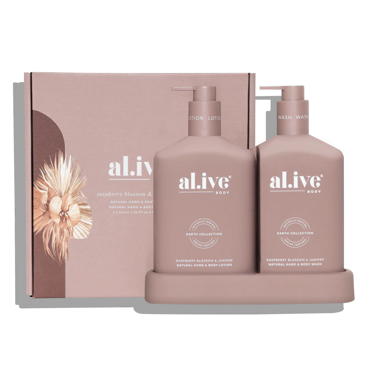 The al.ive body Wash & Lotion Duo in Raspberry Blossom & Juniper contains a luxurious blend of naturally derived ingredients, fortified with essential oils and native botanical extracts.